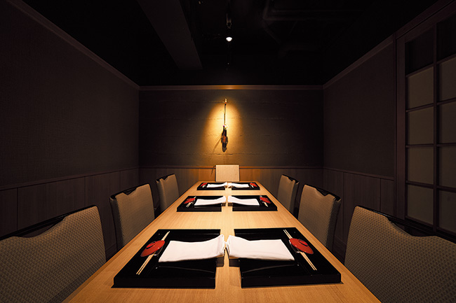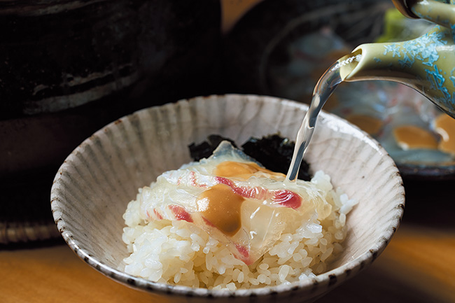 料理は昼も夜も月替わりのコース仕立て。中でも圧巻は、季節を感じる一品が華やかに彩る八寸だ。取り分けやすいよう一人分ずつを小皿に盛るなど、細部までおもてなしの心が表れている。食材との向き合い方、季節や歳時を表した盛り付け、日本の伝統を大切にしたおもてなしの心など、今も変わらない店の根幹は修業時代に学んだという。例えば器ひとつをとっても、脈々と受け継がれる文化や紡ぎ手である先人へのリスペクトがうかがえる。とある秋の献立では、尾形乾山の代表的な絵柄である竜田川と紅葉を写した取り皿を用意。お椀は輪島塗の雲錦模様を使用。桜を雲として、紅葉を錦として描いた琳派の流れを汲む伝統的な絵柄だ。「日本の伝統を眺めるだけにせず、手に取って触ってほしい」という店主の思いに、気持ちもほころぶ。