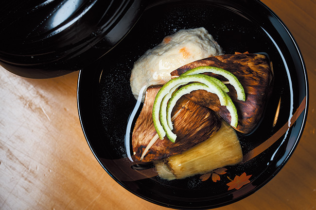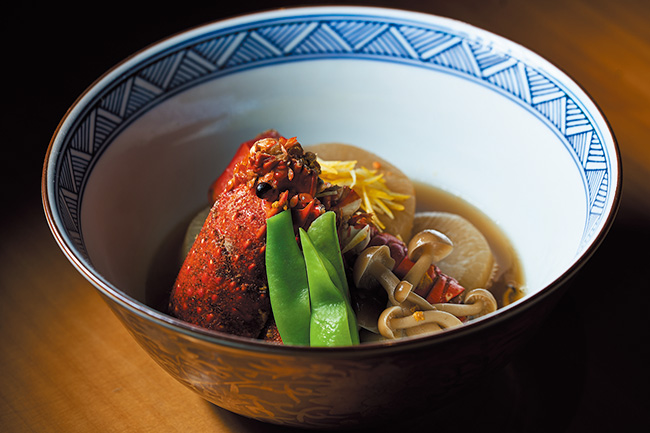 ハレの日に似合う伊勢海老を、修学院離宮で育った聖護院大根、秋のキノコなどと合わせた。