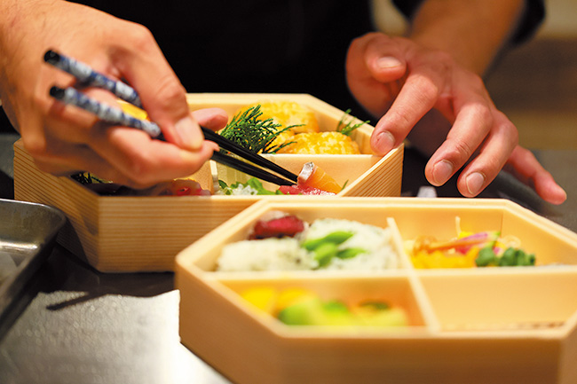主人の石倉大幹さんは「蓋を開けた時の感動」を大切に、京都の日本料理店で研鑽した腕を駆使して料理を作る。毎日柳橋中央市場へ足を運んで厳選する鮮度抜群の魚を使った刺身や焼き物、素材の味を生かした揚げ物など、味も彩りもバラエティ豊かで食べる人を飽きさせない。盛付けも繊細で、見た瞬間心が踊るようなお弁当だ。「お客様から盛付けがきれい、おいしかったという手紙もいただきます」と話す石倉さん。パーティー用のデリバリーや一品料理も充実、店舗から5㎞圏内はデリバリーしてくれるのも嬉しい。