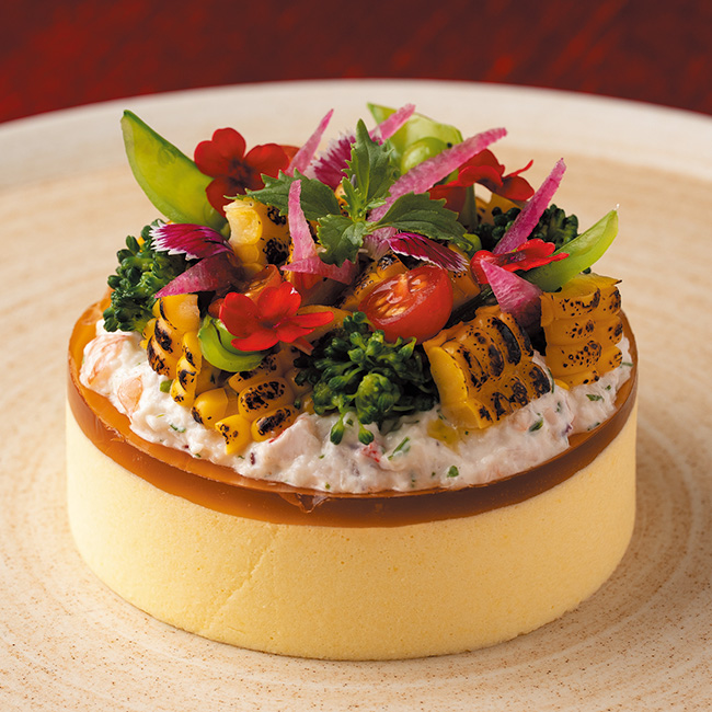トウモロコシの甘味を感じるムースにコンソメのジュレと海老のタルタルを合わせた。シャンパーニュや白ワインと好相性。