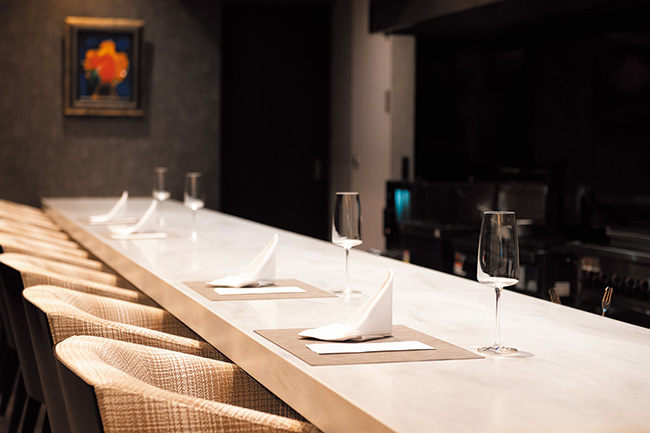 店内を落ち着かせる照明の下で印象付ける1枚の大きなカウンターは特等席。芸術作品を飾るように料理を引き立たせる。