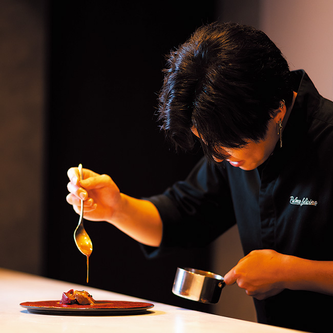 2025年8月、丸の内桜通りを北に入った閑静な通りにオープンした隠れ家レストラン『パルモ フェリチーナ』。「料理でお客様に幸せになっていただきたい」というシェフの深谷さんの想いはその店名に表されている。パルモはイタリア語で「手のひら」、フェリチーナは「幸せに」と「料理」を併せた言葉だ。名店で経験を積んできたシェフの手で創られるのは、イタリアンベースにフレンチと和のテイストを取り入れたイノベーティブ料理。