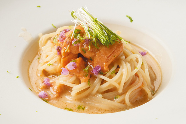 大盛りのウニを楽しめる北海道産ウニの冷製カッペリーニ。