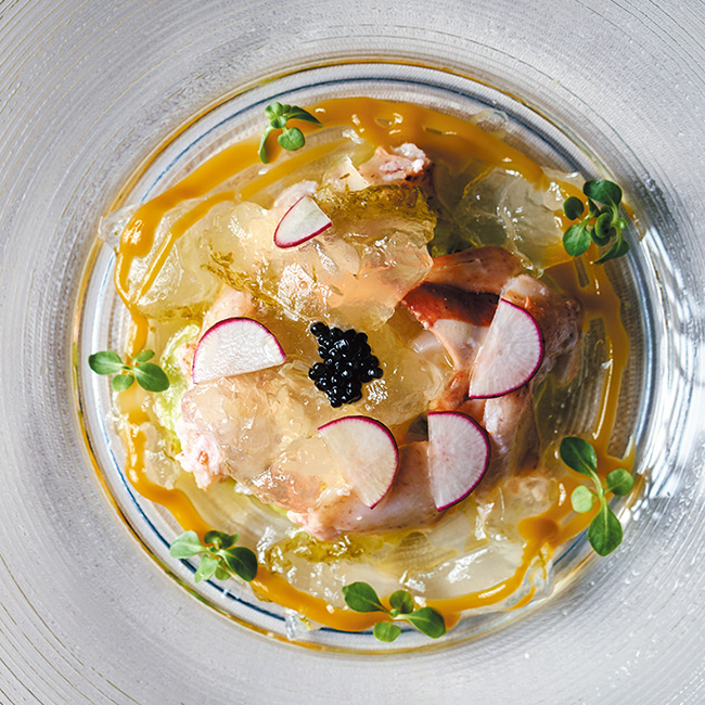 オマール海老のマリネ ライムのゼリーのせアボカドのピューレにライムゼリーをのせ、程よく酸味を感じられる爽やかな味わい。マンゴーのソースが味のアクセントに。