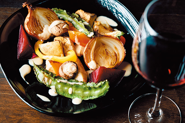 農家直送の有機野菜など安心安全な食材を使うのはもちろん、ベジタリアンや、小麦や牛乳アレルギーなど食に制限がある人も楽しめる、おいしさにこだわった料理を創作する、『オーガニック食堂エンギ』。人気のワンプレートランチは素材の旨味を引き出すように調理された野菜が約5種類と、お豆腐と米粉のキッシュや、お豆腐のモッァレラチーズなどプチオードヴルセットが一緒に盛り付けられていて、まさに野菜づくし。スープも野菜本来の味を活かしたやさしい味だ。塩味はあえて控え目にし、別添えの自家製塩麹で調整できるので塩分を気にする人も安心だ。夜も米粉&ジャガイモの生地がもちもちで香ばしいピッツァや豆乳クリームパスタなどビーガンメニューがいろいろ。野菜との相性を考えてセレクトしたビオワインも取り揃える。