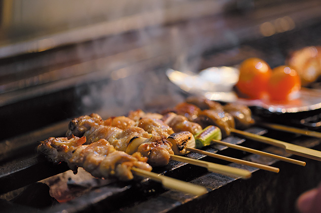 心のこりやちょうちんなど希少部位も揃え、備長炭で焼き上げる焼き鳥。カウンター越しに焼き場を眺めながらの一杯も格段の美味しさだ。