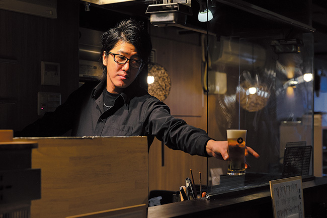 酒類も豊富。首都圏と愛知県の一部で限定販売のプレミアムな樽生ビール「白穂乃香(しろほのか)」のほか焼酎、日本酒、ワインと、好みやその日の気分で楽しめる。4人掛け席も3席あり、小グループの集まりにも良いが、リラックスした表情で過ごす一人客もいるのが同店の魅力。集まりの前後に一杯という常連客や、丼を頬張る出張とおぼしき客など人それぞれ。深夜営業しているのもありがたい。