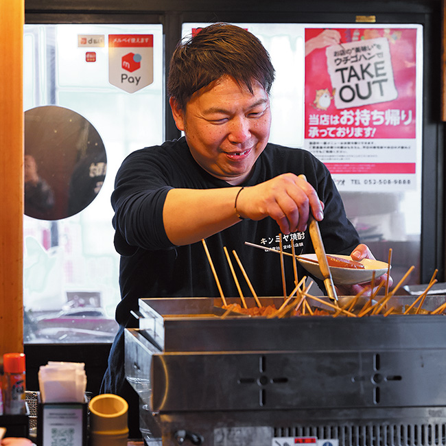 戸を開けた途端、香ばしい味噌の香りと朗らかな「いらっしゃいませ」の声。肩の力がスッと抜ける和やかさが『みやにしテツオ』らしさだ。人気は、八丁味噌を独自にブレンドした自慢の味噌おでん。大根、厚あげ、こんにゃく、里芋、玉子は単品だと各154円のところ、盛り合わせは全部入って770円。しかも「大根を外して厚あげ2つに」といったワガママに応じてくれるのも嬉しい。どて串や味噌カツ、手羽先などの名古屋めしのほか豊富な料理メニューも好評だ。