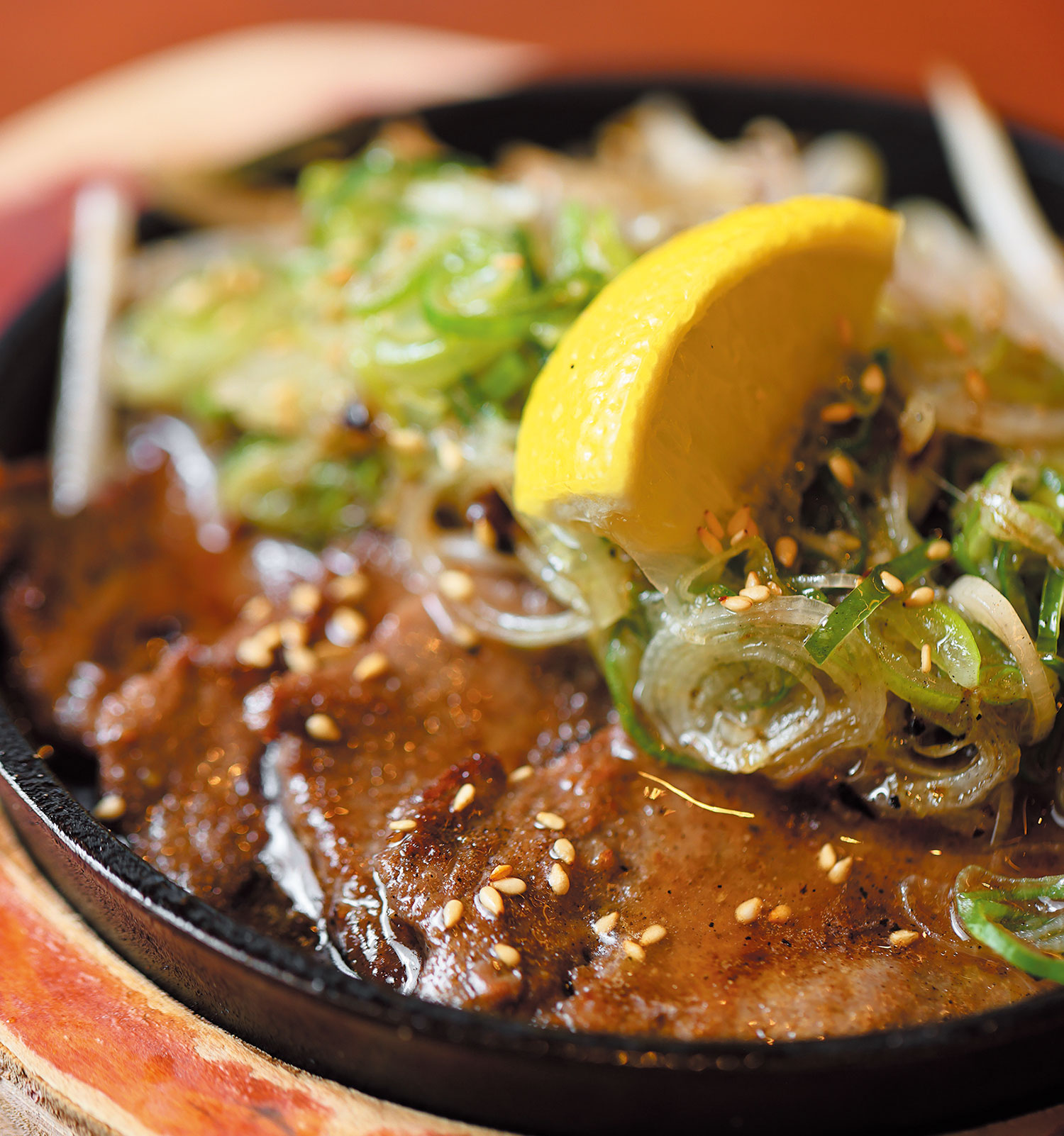 全国各地の旬の食材を生かした品々を随時味わえる。この日のイチオシは「肉厚ネギ塩牛タンの豪華鉄板焼き」¥1,309