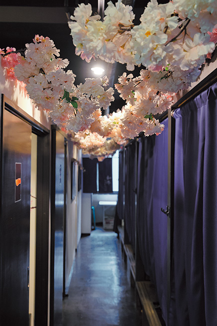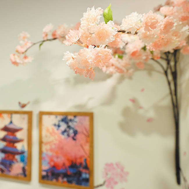 あちこちに満開の桜が。店に入ってすぐの通路にある桜は夜桜を感じる。通路右は掘りごたつ式の座敷席で、左は半個室タイプのテーブル席になっている。