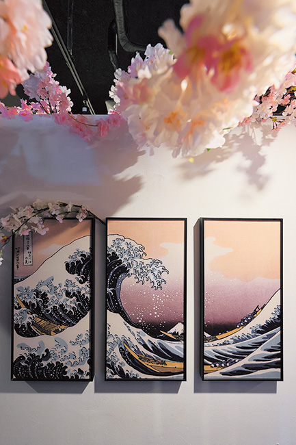 客席や通路など各所には、日本の風景や和をモチーフにしたイラストが飾られている。