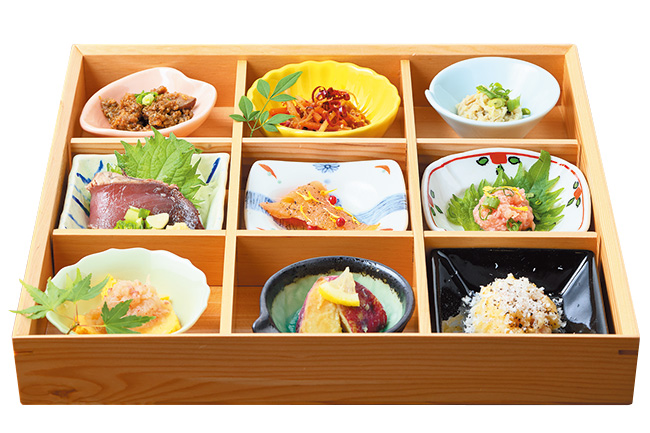 本日の前菜・お刺身BOX目と舌で存分に味わう、旬の食材を生かした9品。