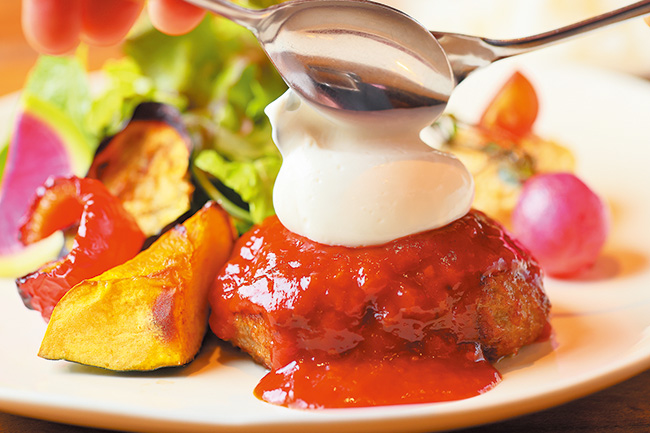 最後にふんわりとチーズソースをトッピングするトマトチーズソースハンバーグ(ライス付)¥1,250は、ランチタイムの人気メニュー。