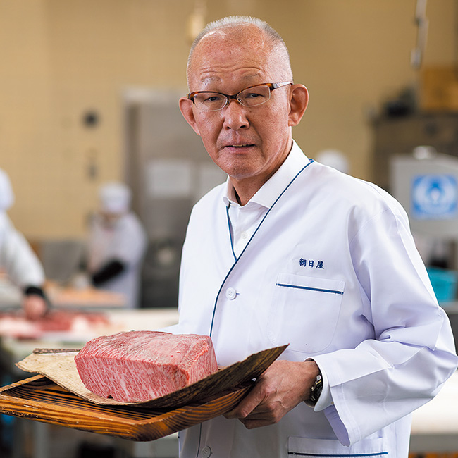 三重県津市の老舗精肉店『朝日屋』。創業から60余年にわたって「より良い松阪肉を、よりお値打ちに食卓へ」をモットーに、契約肥育農家からの一頭買い、自社解体・加工による流通コスト削減などを徹底し、圧倒的な品質と価格を誇る。同店で扱う松阪牛は、宮川の清流と豊かな緑に囲まれた環境で、2年半以上手塩にかけて育てられた雌牛のみ。「つきたての餅のよう」と称されるその肉は、艶やかな赤身に細やかな脂が優美な霜降りを描く。融点が極めて低い脂は、舌にのせた瞬間に溶け、芳醇な香りと甘味がふわりと広がる。