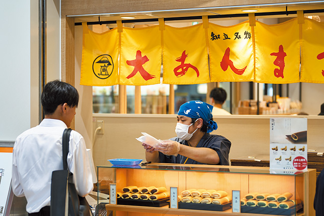 『藤田屋』の大あんまきコーナーを常設。十勝産小豆100%の手作りあんを使った知立の名物。あずき・白あん・チーズ・カスタード・抹茶・栗の6種類。