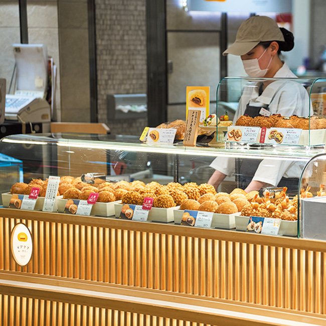 さて、名古屋駅の歴史を見つめ続けてきた老舗が新事業として2022年に『マツウラベーカリー』を立ち上げた。カレーパンのフィリングに使われている鶏肉は、「天下とり御飯」と同じ素材を使い、肉の配合比などにこだわっているため冷めてもおいしい一品。駅弁とベーカリーに一見関連性がないように見えて、『マツウラベーカリー』のカレーパンには駅弁作りで培われたノウハウがしっかりと凝縮されているのである。数あるパンのなかでも、昨今「名古屋らしい」と人気を集めているのが「海老タル」。名古屋城の金鯱を海老フライで表現しているのがなんともユニークだ。使用されるブラックタイガーは一つひとつ手作業で殻をむくなど、素材や味に対するこだわりも抜かりなし。新・名古屋名物の大本命だ。