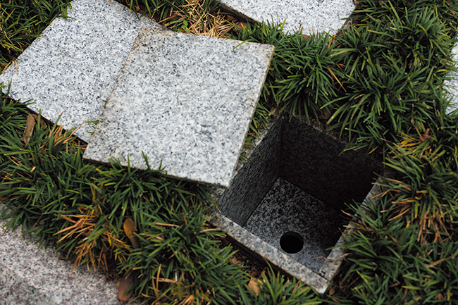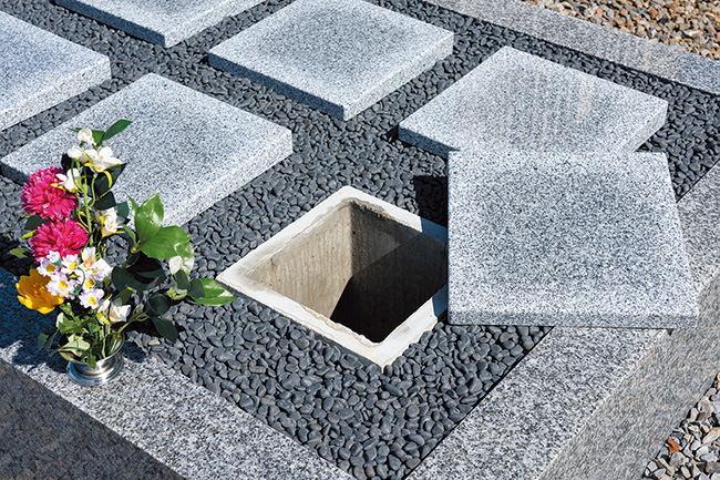 墓石の下に納骨スペースがある。最後に入られた故人から数えて7、13、23回忌の節目で合祀となる。(吉良さくら彩苑)