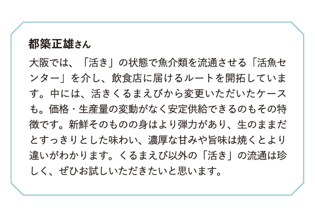 「うるみえび」の陸上養殖を手掛ける『ニテラアクア』。自動車部品開発で培われたセンサー技術の活用で、高い品質のエビを安定的に供給する。水質などの徹底管理により、臭みがなく、まろやかな甘みと旨味、弾力があり、殻は薄く、頭から尻尾まで安心して食べられるエビになる。養殖環境の調整で味や大きさのコントロールも可能だ。そんな「うるみえび」を、より鮮度の高い「活き」で届ける流通ができつつある。大阪ではすでにルートを確立。これから東海圏でも展開する予定だ。同社の都築正雄さんは「元々鮮度のもちのよさも評価いただいていますが、さらに新鮮そのものを提供できるようになり、目の前で〆るパフォーマンスなど、可能性が広がります」と話す。