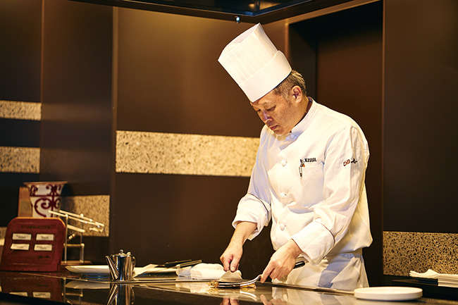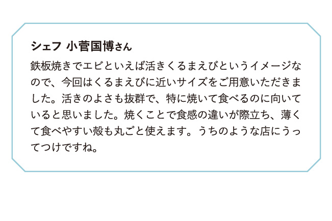 「活きうるみえび」を調理してくれたのは『鉄板焼き 団居』のシェフ、小菅国博さん。「食感が、『活き』の状態から焼くことで全く違ってきます。柔らかい殻はカリカリのえびせんべいにして添えました」。『団居』では期間限定で「活きうるみえび」を使ったメニューをコース内で提供。この機会に、その味わいを体験してみてはいかがだろう。