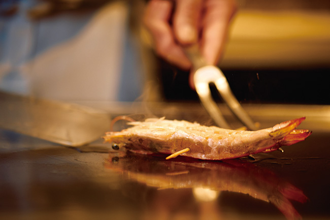 跳ね躍る「活きうるみえび」を鉄板にのせ、鮮やかな手さばきで仕上げる様に、目が釘付けに。