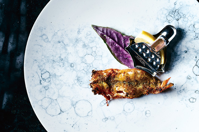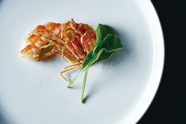 「活きうるみえびの香草パン粉焼き」。旨味と香草の芳しさ、サクサク食感がハーモニーを奏でる。