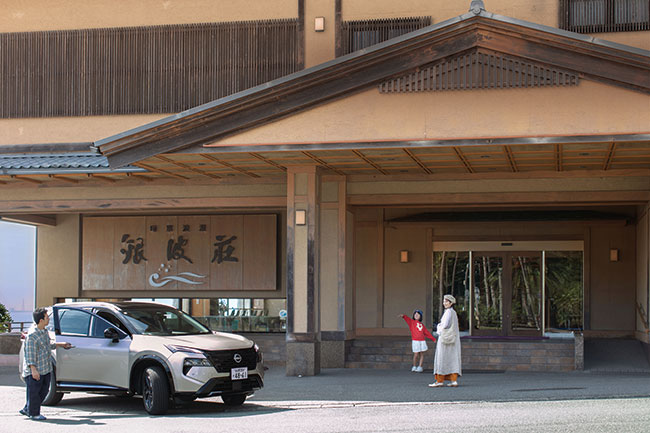 エクストレイルに乗ってドライブに出かけるのは、伊与田さんファミリー。義隆さん・亜未さん夫妻は安城市にある洋菓子店『アンドケイクスパッチ』を営んでおり、休日は勉強も兼ねて近隣の洋菓子店などへ車で出かけることも多いという。そして義隆さんはサーフィンを楽しみに渥美半島へ出かけることも多いアクティブ派。アウトドアシーンとも相性がよいエクストレイルのエクステリアやインテリアに、さっそく目を輝かせていた。今回目指すのは蒲郡市にある西浦温泉。途中、国道のバイパスの本線に合流する際に、なめらかな加速を体感したようで、思わず感嘆の声が漏れる。温泉街に入る直前のワインディングロードも、手元のドライブモードセレクターを駆使して力強く走破。ノンストレスで目的地に到着した。西浦温泉の名宿『銀波荘』に新しく誕生した『温泉喫茶 シノノメ』でスイーツや足湯を満喫した伊与田さんファミリー。たくさん遊んだあとの帰路では、後部座席で長女の絢ちゃんがすやすやと。ドライバーだけでなく、乗員すべてにやさしいのもエクストレイルの魅力だ。締めくくりには『ホテルグランドティアラ南名古屋』でディナータイム。こんなロマンティックなシーンにも、エレガントなエクストレイルは寄り添ってくれる。