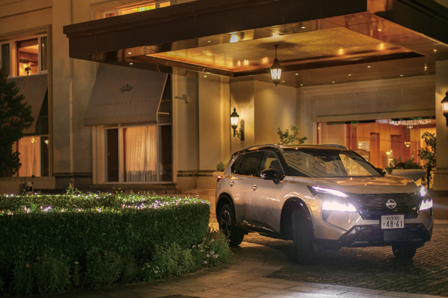 『ホテルグランドティアラ南名古屋』のエントランスに乗り入れるNEWエクストレイル。ラグジュアリーな雰囲気を醸すシティホテルともマッチする、上質なエクステリアデザインが特長だ。撮影協力:ホテルグランドティアラ南名古屋